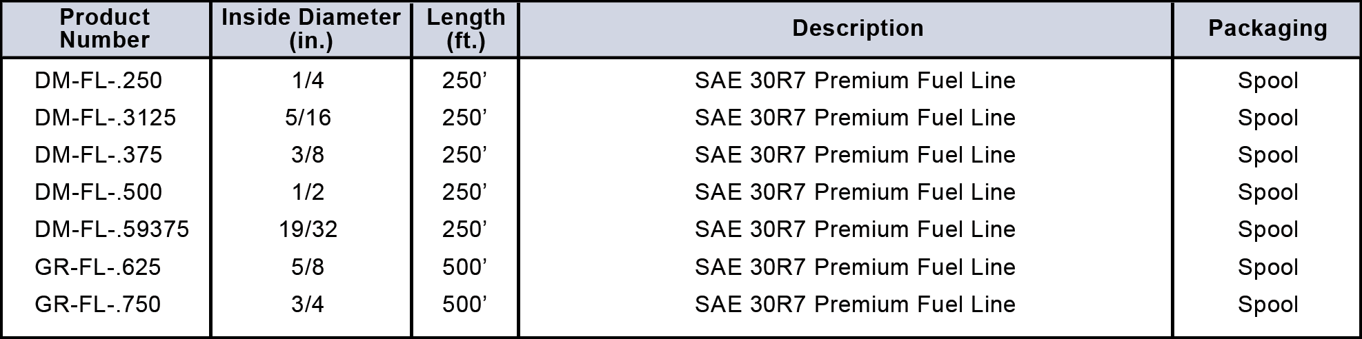 Designed to carry most modern fuels in cars, trucks, buses, etc. Handles temperature ranges of -40 to +257 Degrees F. Withstands oil, grease, abrasion and ozone. An excellent product for all diesel based fuels. Meets or exceeds the burst requirements of the SAE30R7 specification.